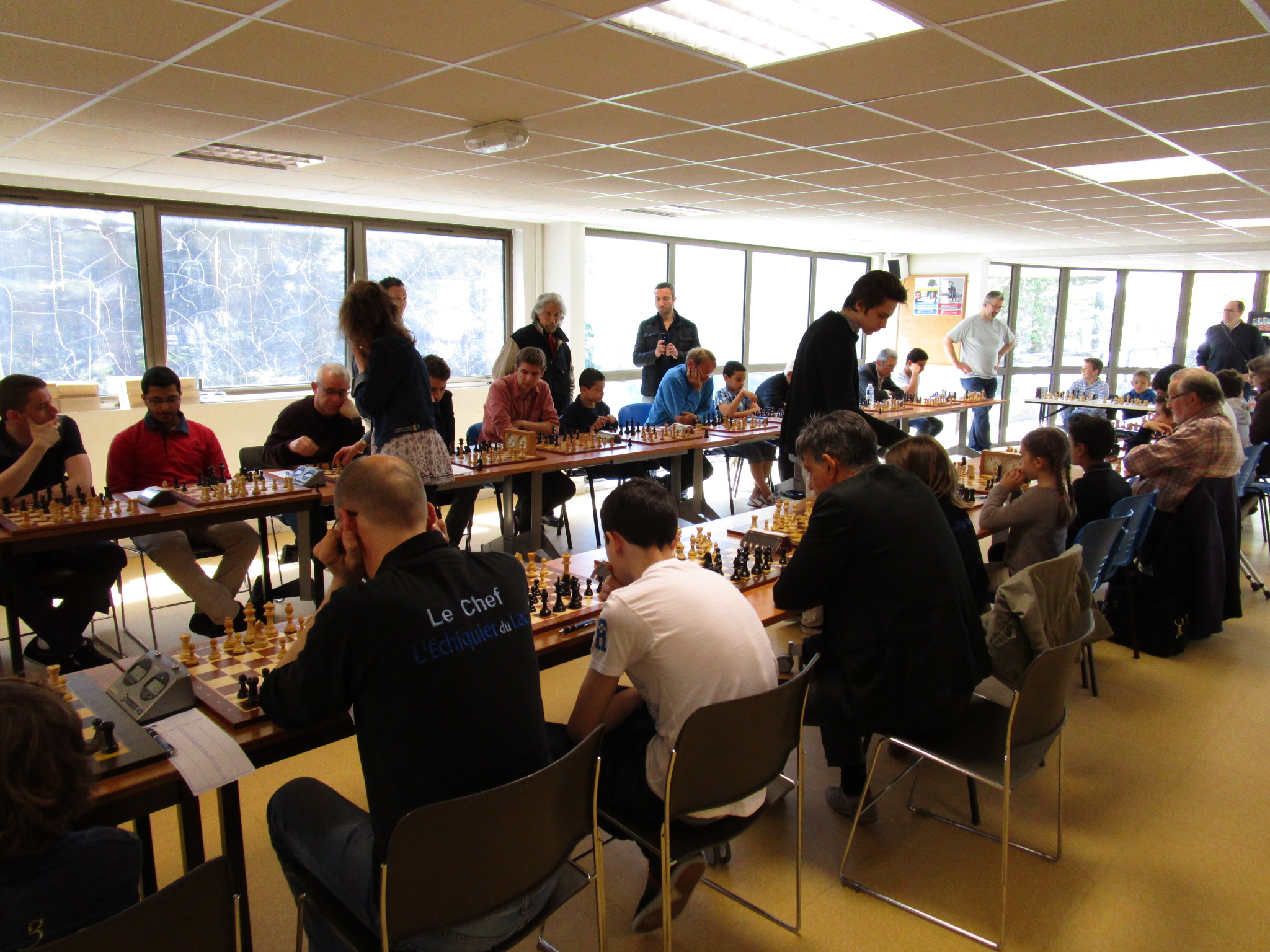 Alain : Bonjour, je prends l’antenne – Il est 13h45, nous sommes le samedi 11 Avril en direct de la ville d’Écouen et nous allons assister en direct à un match passionnant car décisif entre le « Kéres *» de la Nationale 3 , j’ai nommé Enghien, et la redoutable équipe d’Écouen. La rencontre sera arbitrée par Melle Lucie Argenté de l’équipe d’Écouen. Les conditions de jeux sont bonnes : locaux spacieux, silencieux et bien éclairés, café à volonté et même une tribune de presse où nous nous situons avec un panorama sur l’ensemble des échiquiers.