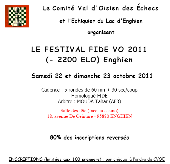 Et le 22 et le 23 octobre, Enghien organisera à la salle des fêtes la première étape d’un cycle de tournois FIDE dans le Val d’Oise. Un beau week-end de parties longues en perspective…