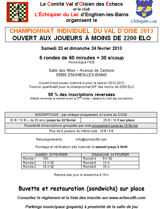 Comme vous le savez sans doute, le Championnat du Val d’Oise 2013 aura lieu le weekend des 23 et 24 février à la Salle des Fêtes d’Enghien.
