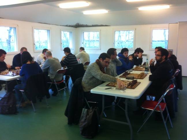 14h22. Le coup d’envoi est donné – le fatidique et traditionnel « les noirs appuient sur la pendule » est prononcé par le capitaine rueillois, M. Lestrelin. Les conditions de jeu sont bonnes ; température intérieure 22 degrés – temps sec – salle calme – grand espace de jeu entre les échiquiers – café à volonté.