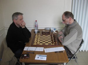 Après avoir repoussé avec sang froid et précision l’assaut immédiat de mon adversaire, et tandis que la partie s’acheminait vers une nulle tranquille, je voulus finasser et lâchais un pion sans compensation. Mon adversaire augmenta peu à peu son avantage d’espace me réduisant à la plus grande passivité. Mais ma pseudo-forteresse n’était pas facile à casser, et au lieu d’un sacrifice d’un ou deux pions pour infiltrer son roi, mon adversaire pressé par le temps choisit de transposer dans une finale de roi que j’annulais de justesse.