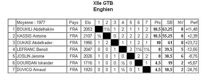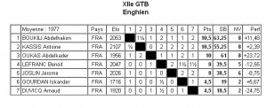 Rassasiés par une copieuse collation chinoise, les 7 samourais disputèrent un double ronde qui resta longtemps indécis. En effet, Abdelhakim, sur la lancée de sa victoire dans le dernier TSR, prenait un départ canon en alignant les points, pour commencer (enfin !) à lâcher quelques points vers 1 h du matin. Au final, c’est la confrontation entre les deux Abdel dans la dernière ronde qui décide du podium, et Abdelhakim s’offre un doublé TSR-GTB, devant Antoine (devancé au départage) et Kader.