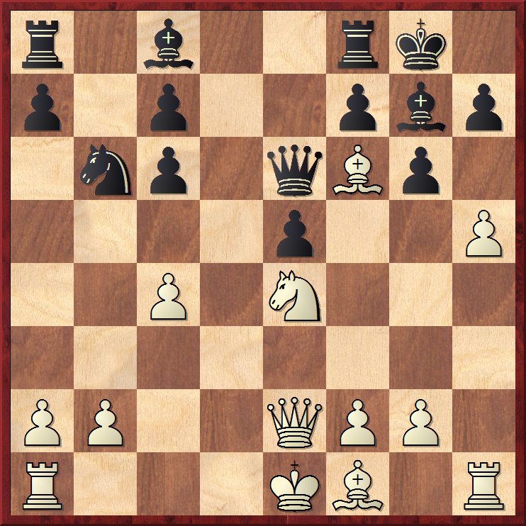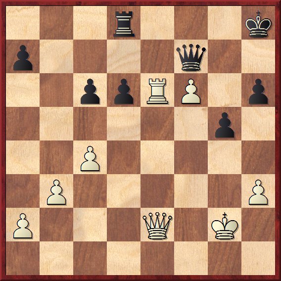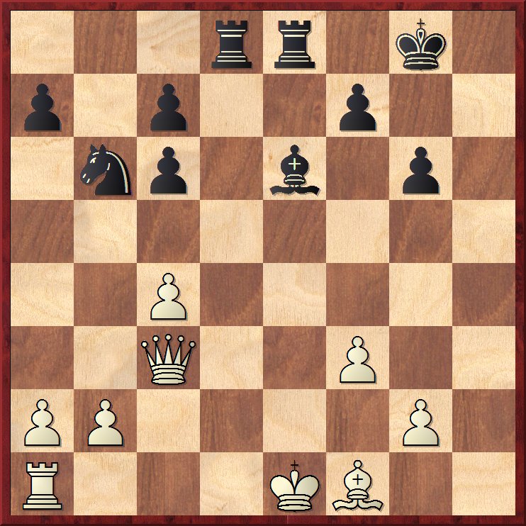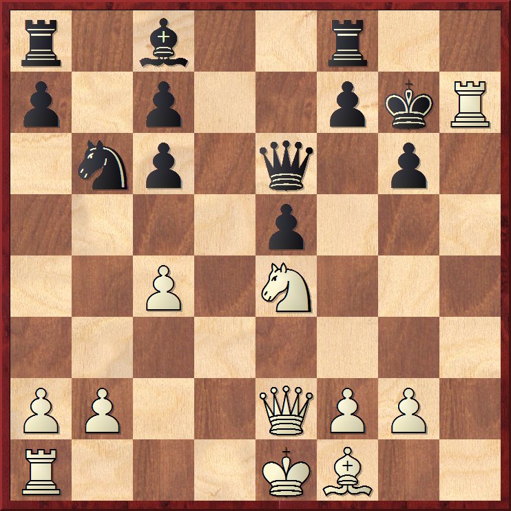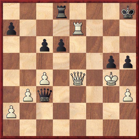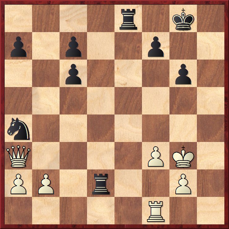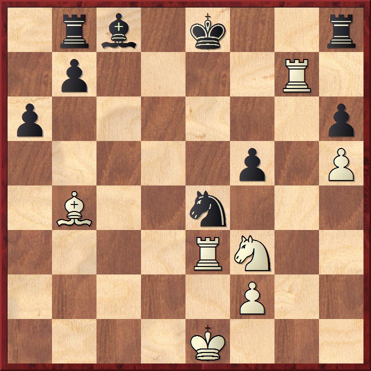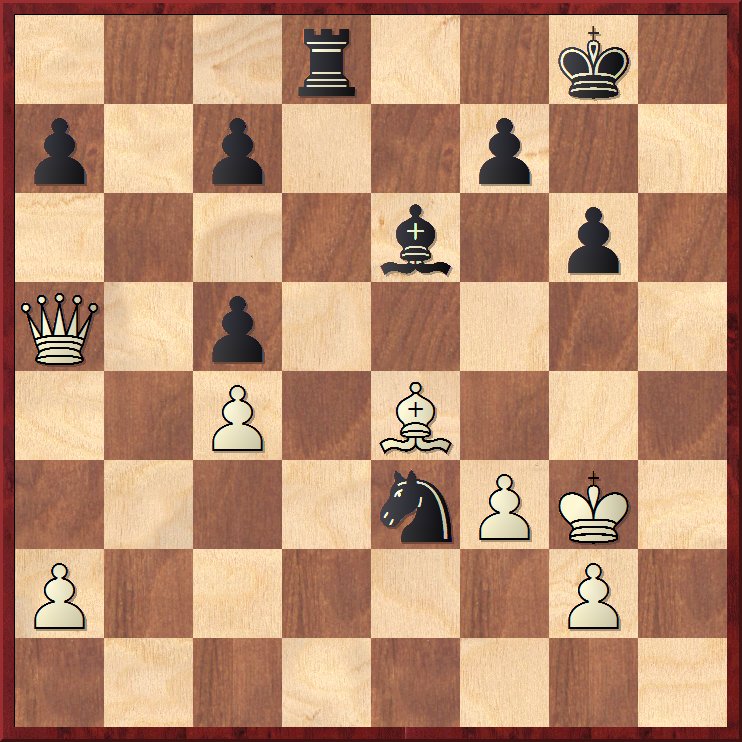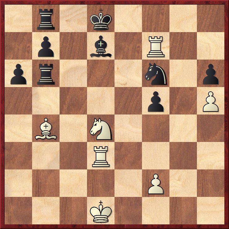 Malgré l’échange des dames, le roi noir est dans un réseau de mat : 31…Fd7 32.Te7+ (32.Ce5 !) Rd8 33.Td3 Cf6 34.Tf7 ! Les noirs perdent du matériel 34…Te8+ 35.Rd1 Te6 36.Cd4 Tb6