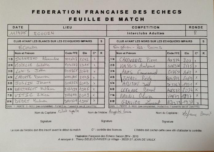 Géraldine : Le Elo moyen reste à l’avantage d’Écouen avec 2082 Elo contre 2055, avec de surcroît des classements supérieurs sur 6 échiquiers sur 8. Beaucoup de joueurs d’Enghien étant classés en dessous de leur vraie valeur, on peut parler malgré tout d’une rencontre équilibrée.