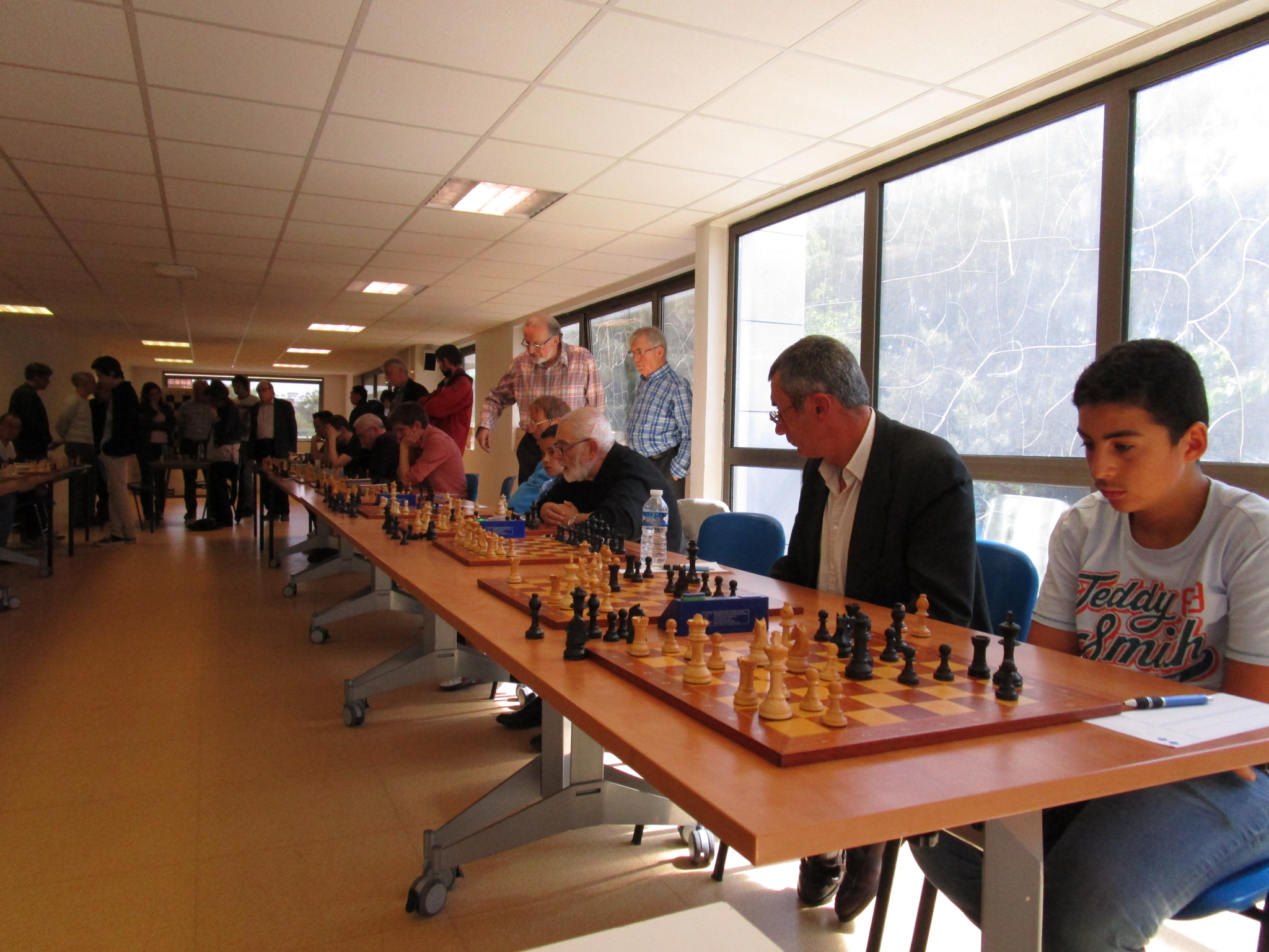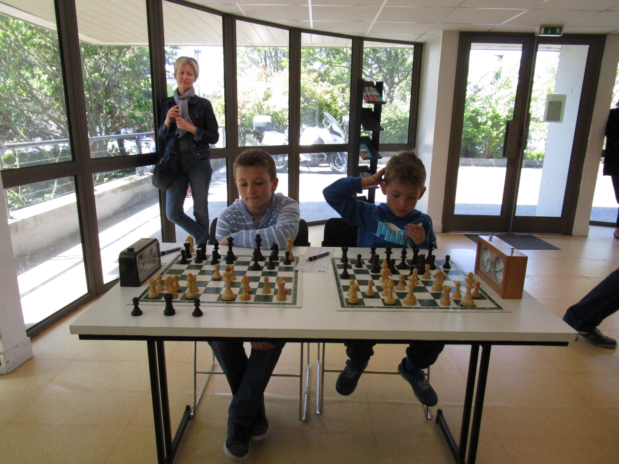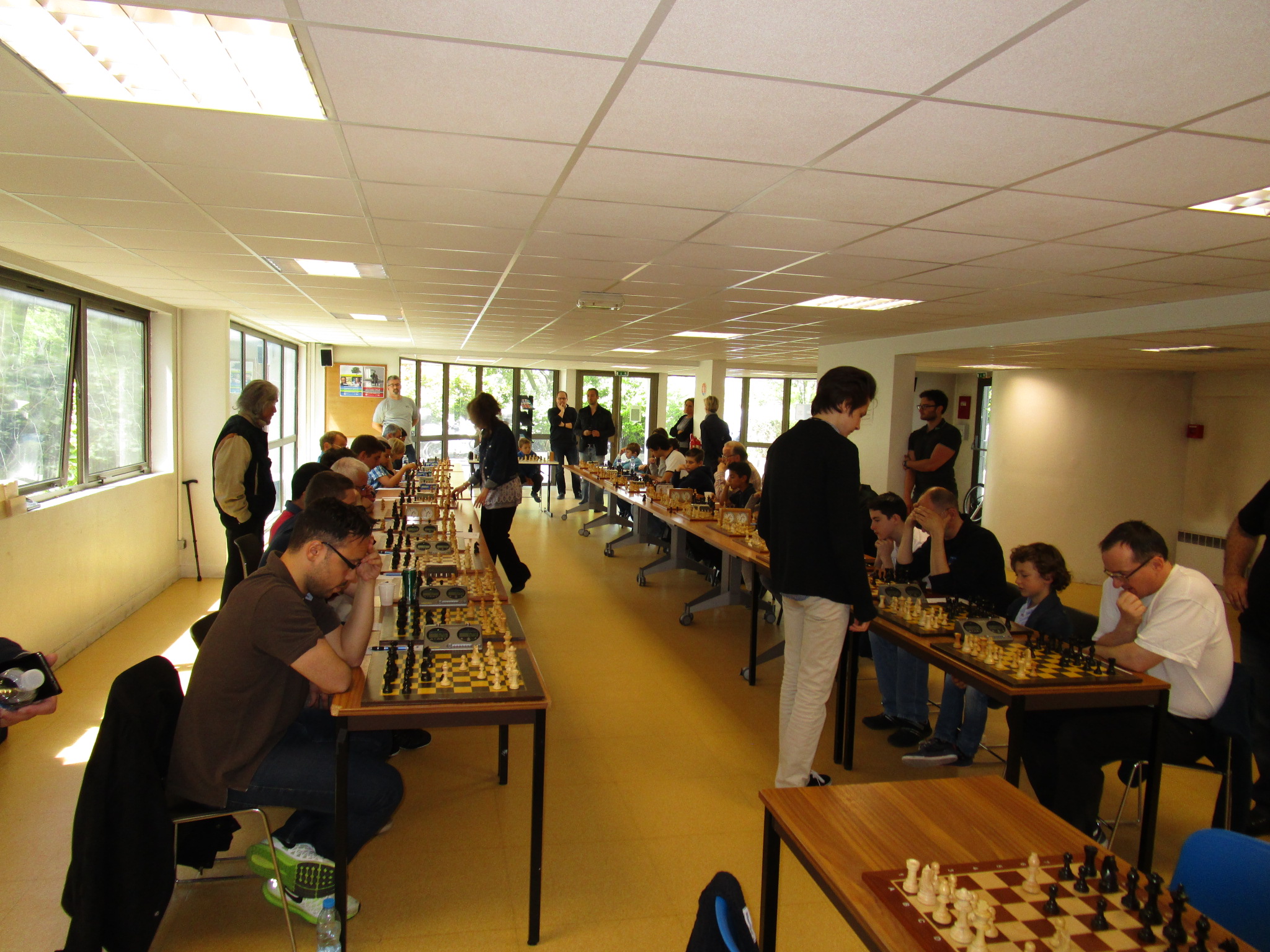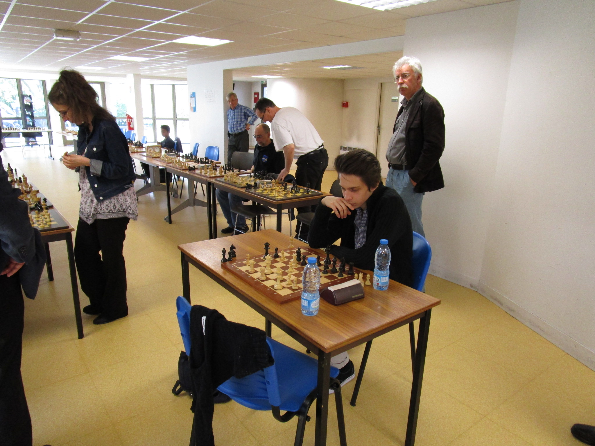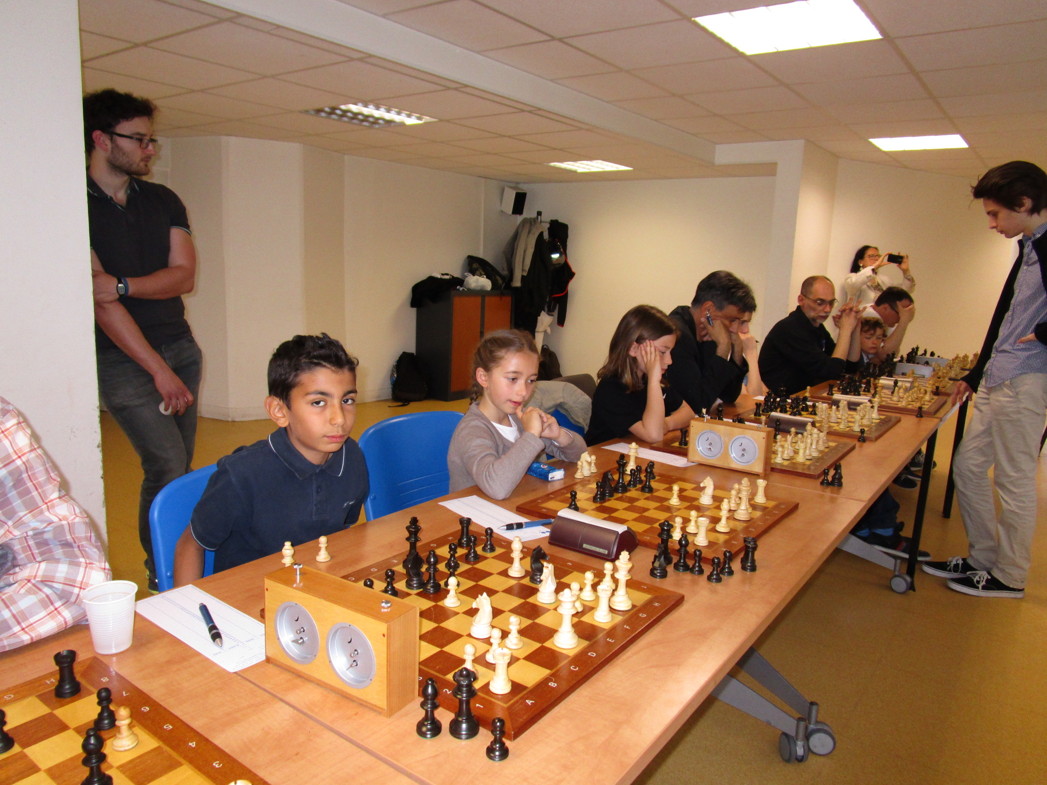 Une fois toutes les parties terminées et les forces récupérées grâce à un goûter copieux, nous avons demandé aux deux champions de faire la revanche de leur première partie, mais à l’aveugle ! Je n’ai malheureusement pas de photos de la partie (je bougeais les pièces sur l’échiquier mural :)) mais vous pourrez la voir dans la vidéo tournée par la journaliste de “VO TV” :