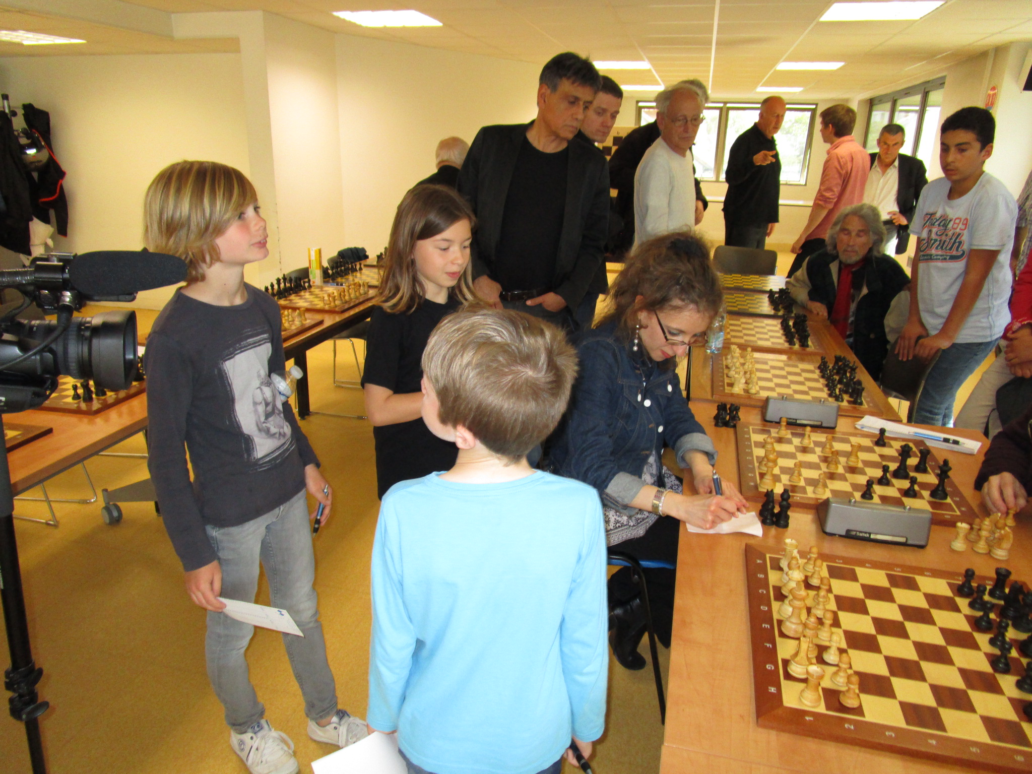 Pendant que Jules “fait le ménage” sur ses échiquiers, l’attention des spectateurs se détourne soudain vers la partie entre les deux champions. Il y a même la caméra de VO TV !
