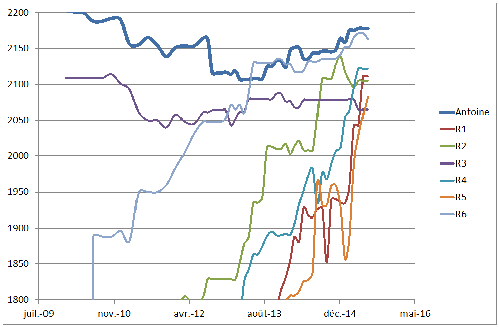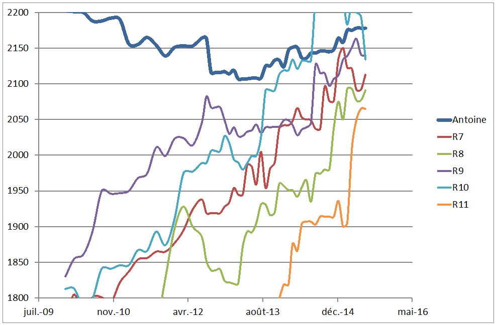 Comme vous pouvez le voir, je me suis amusé à représenter l’évolution Elo de mes 11 adversaires (R1 à R11) au cours des 5 dernières années. La grosse courbe en bleu, en haut, c’est moi. Plusieurs de mes adversaires ont une progression à + 150 points Elo/an. Je peux vous assurer que pour certains d’entre eux, je voyais même leur niveau monter pendant la partie. C’est de la triche !