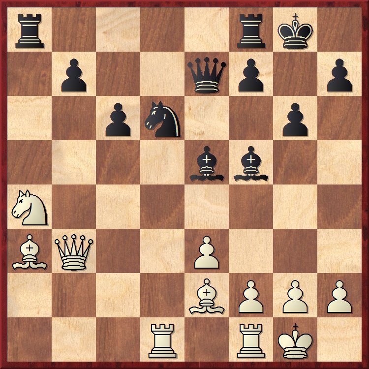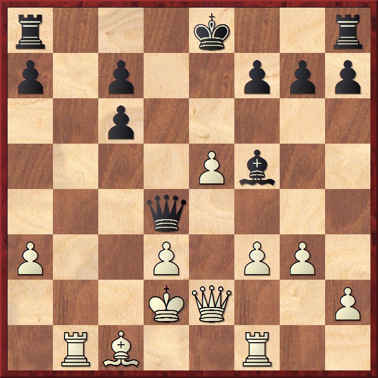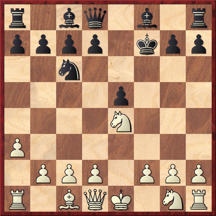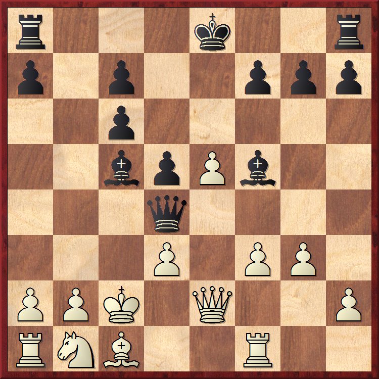 Cela dit, si l’on revient à la partie et à la position de l’avant-dernier diagramme, 14… 0-0 reste un bon coup, avec l’idée d’ouvrir un nouveau front avec f7-f6. Les blancs essaient tant bien que mal de se libérer et nous arrivons à la position suivante :