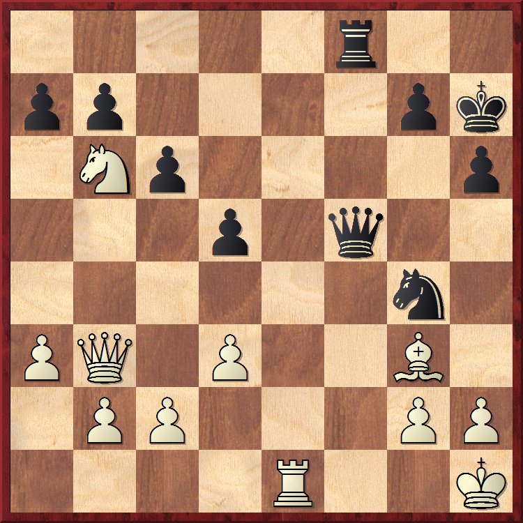 Pour moi, le seul coup était 29. Rg1, sur quoi j’avais prévu 29… Ce3 ! (menaçant encore de sacrifier la dame en f1) 30. h3 (cette fois, c’est le bon coup) Dg5 ! et ici les blancs doivent être très précis. Quand je lui ai montré cette position à l’analyse, mon adversaire m’a dit qu’il aurait joué 31. d4 :