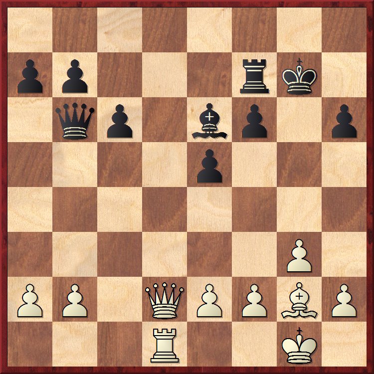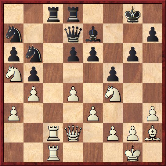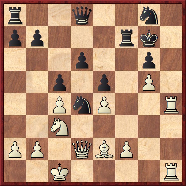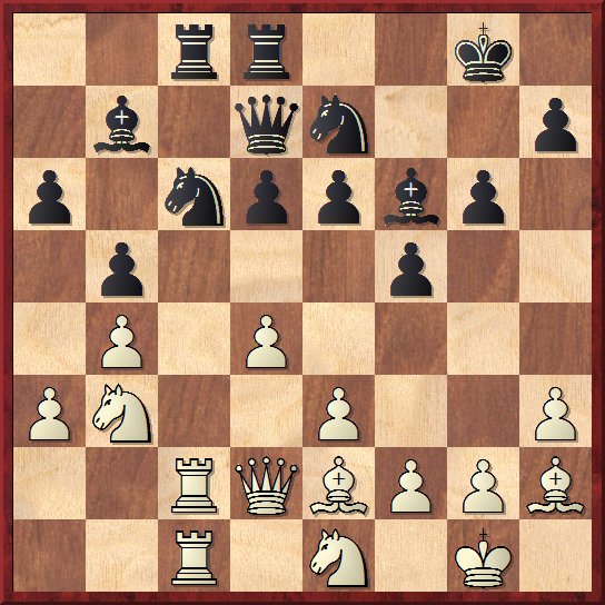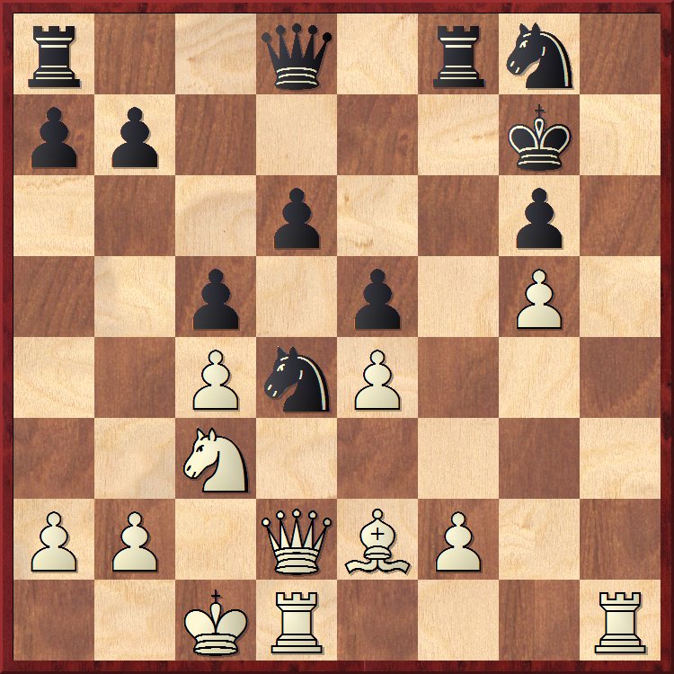 Par leur dernier coup, les noirs cherchent à échanger les fous de cases noires par Fh6, pour se débarrasser de leur mauvais Fg7. Ma position est très agréable avec la paire de fous, un roi à l’abri, du jeu sur le roi adverse, une belle case d5 et un pion faible en d6. Cependant, il faut agir vite avant que les noirs ne se libèrent :