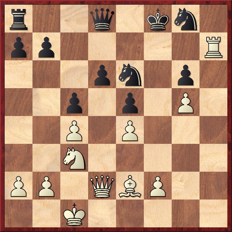 Être en forme et en confiance n’empêche pas de faire des erreurs ! 18…Tfd8 était requis, avec une partie proche de l’égalité. À la manière dont il exécuta ce coup que j’avais estimé mauvais, je me suis dit que j’avais dû rater un truc. Et en cherchant (mais pas trop longtemps car je n’avais plus beaucoup de temps), j’ai fini par trouver.