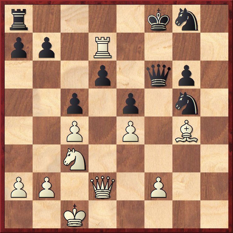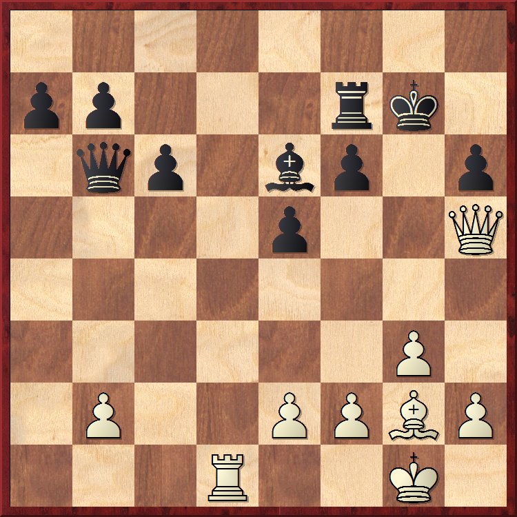 28… Dxg5 est bien sûr impossible à cause de 29. Fxe6, et sur 28…Cf4, le gain s’obtient (entre autres) avec le mignon 29. Fd7 ! interceptant la défense du Pd6 par la dame.