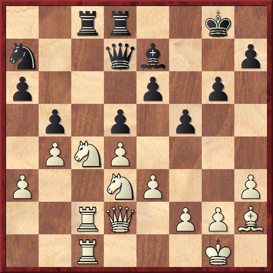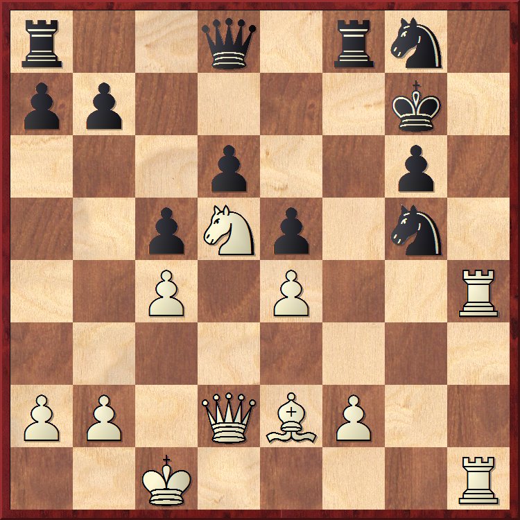 Normal, mais ratant l’astucieux 21… Tb5 !! 22. Fxf8 Txe5 23. Rd2 Cxb3+ 24. Rc3 Rxf8 25. Rxb3 et les noirs ont deux pions de plus et une finale facilement gagnée. La pointe est que 22. Fxc6 ? n’est pas possible à cause de 23… Txe5 + ! suivi de 24… Cd3 +.
