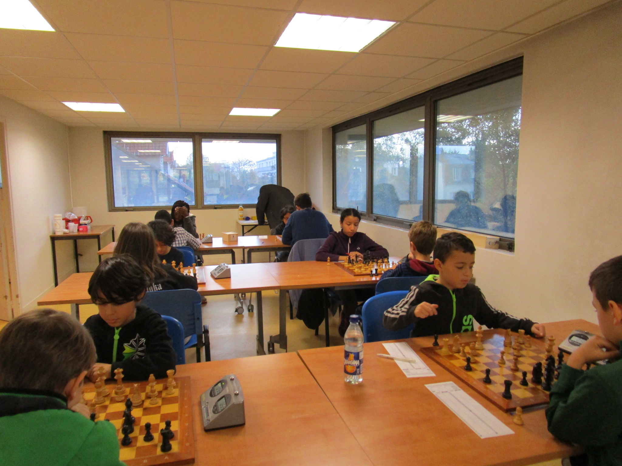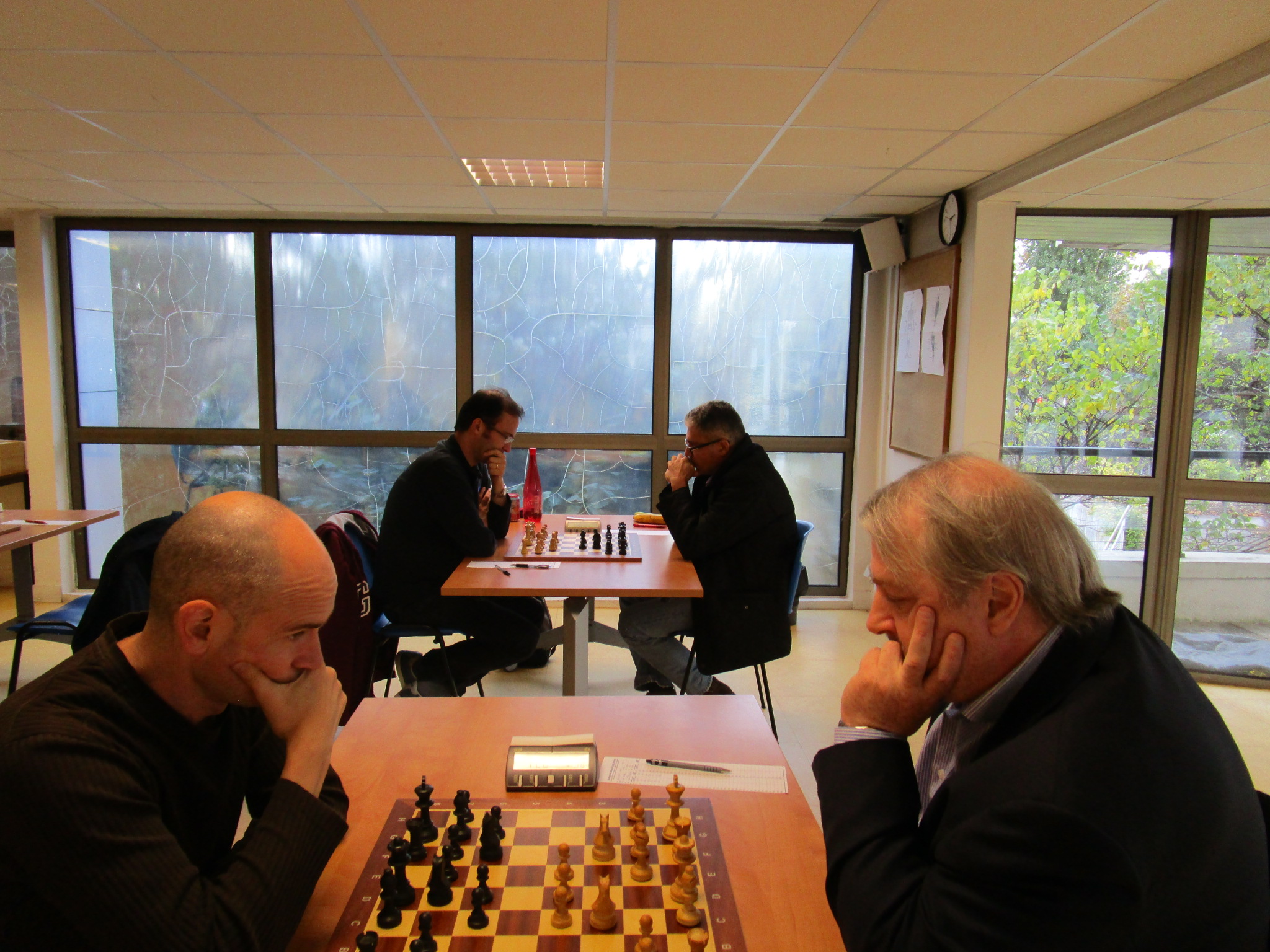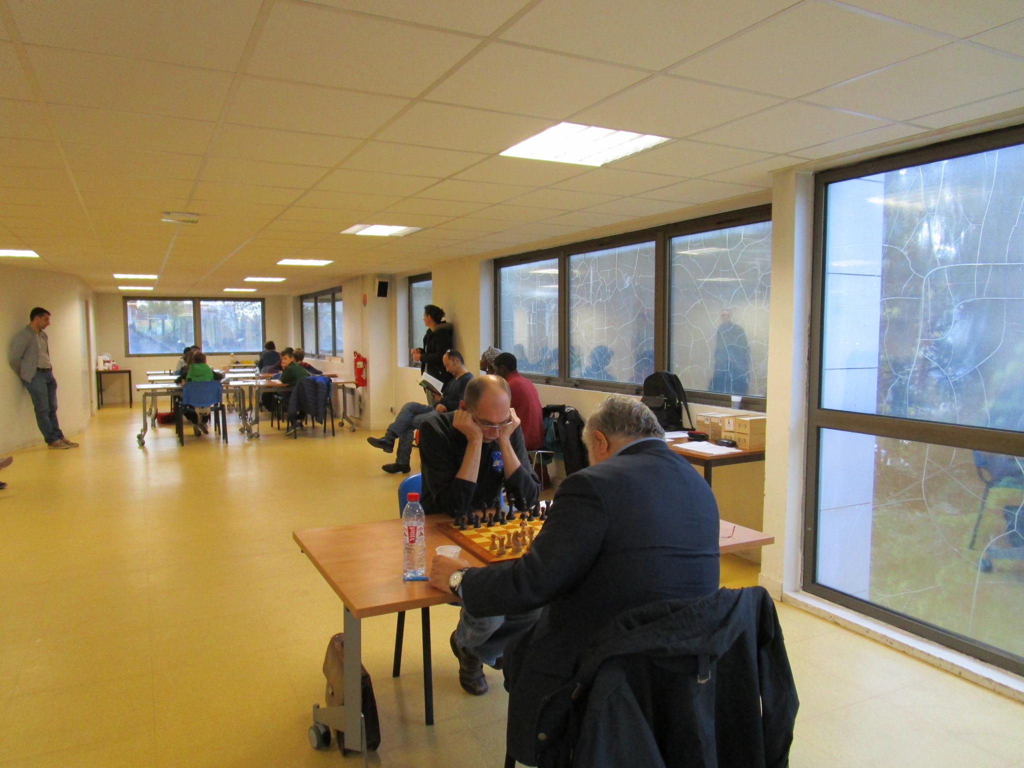 Les jeunes de l’école d’échecs du Prof allaient jouer dans le même espace que nous. Parmi les va-et-vient préalables aux deux matches, Benoît me souffla avec un rien d’inquiétude qu’il avait cru reconnaître quelqu’un de chez eux… en effet. Anatoly Vaïsser attendait discrètement devant la porte. À la faveur d’une composition hautement stratégique de notre feuille de match, Benoît avait prévu d’affronter lui même un premier échiquier de ce genre… Enfin, s’il n’y avait pas en réserve un autre grand maître plus fort, ce qui aurait pu se faire ! Finalement non, nous aurons droit à une compo « soft », avec un seul GMI