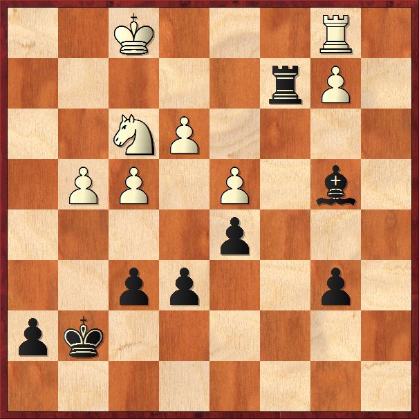 Les blancs décidèrent finalement de jouer 33 Fb6 ?! (ils auraient dû jouer simplement 33.bxa5 a3 34.a6 et chaque camp a son pion passé !) Tc8 34 Fxa5 ? (34.bxa5 a3 35.a6 était meilleur) Txc3 !! + 35 Rd4 (évidemment si 35 Rxc3 Fe5 + suivi de Fxa1) 35…Fxb4 !!