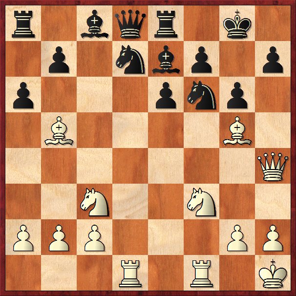 15…a6xb5 Les noirs ont accepté le sacrifice des blancs, mais ils n’avaient de toute façon pas beaucoup de coups à leur disposition, par contre ils commettent l’erreur décisive après 16 Cxd7, en reprenant avec le cavalier f6 16…Cf6xd7 ? car un deuxième sacrifice assomme les noirs : 17 Tfxf7 !! (eh oui, sur 17.. Rxf7 ?? suit 18 Dxh7 + Rf8 19 Fh6 mat ! )