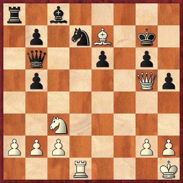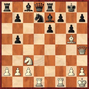 On se dit que la partie va se terminer très rapidement, et nous obtenons la position suivante, où manifestement, le roi noir est bien mal à l’aise… Psychologiquement, quand on a déjà sacrifié un fou et une tour, même si c’est un pseudo-sacrifice, il n’est pas évident de sacrifier encore une troisième fois :
