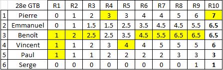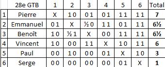 La qualité a pallié l’absence de quantité pour ce 28e GTB. Et si les vétérans ont finalement conservé – de justesse – leur suprématie, ils furent bousculés par les jeunes pousses, en témoignent les victoires de Paul sur Emmanuel et de Vincent sur Pierre à la première ronde.