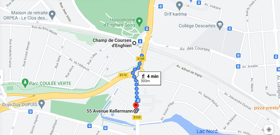 – la gare SNCF de Champ de courses d’Enghien (réseau Paris-Nord, directions Saint-Leu-la-Forêt ou Pontoise à partir de Gare du Nord) est à 4 minutes à pied ;– la gare RER C de Saint-Gratien est à 1,7 km.