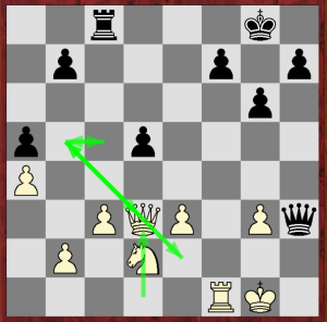 La pièce de plus des blancs compte évidemment pour des prunes, puisque les noirs vont faire échec perpétuel. Les flèches vertes illustrent les mouvements de la dame (d1-d3-b5-c5-b5-e2-b5-d3) et montrent bien qu’elle n’est pas restée là à poireauter.